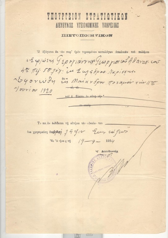 Ο ΣΤΡΑΤΙΩΤΗΣ ΓΕΡΟΓΙΑΝΝΗΣ ΓΕΩΡΓΙΟΣ ΤΟΥ 4ου ΠΕΖΙΚΟΥ 5ου ΛΟΧΟΥ ΕΚ ΣΚΛΗΘΡΟΥ ΛΑΡΙΣΣΗΣ ΕΦΟΝΕΥΘΗ ΕΙΣ ΜΑΙΑΝΔΡΟΝ ΠΟΤΑΜΟΝ (ΜΙΚΡΑ ΑΣΙΑ) ΤΗΝ 11ην ΙΟΥΝΙΟΥ 1920