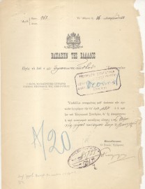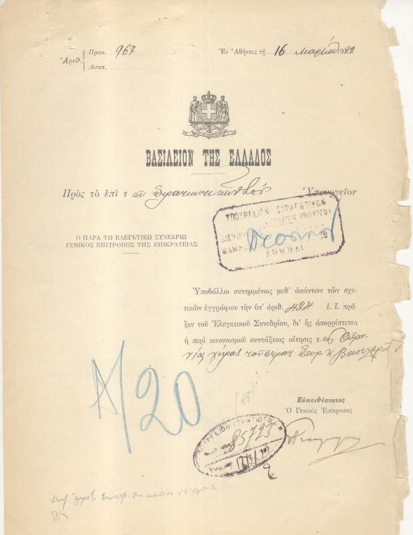 Υποβάλλω συνημμενως μεθ´ απάντων των σχετικών εγγράφων την υπ´ αριθμ. 484 ε.ε. πραξιν του ελεγκτικού συνεδρίου, δι ής απορρίπτεται η περι κανονισμού συντάξεως αίτησις της Ουρανίας χήρας του στρατ. Βασιλαρά