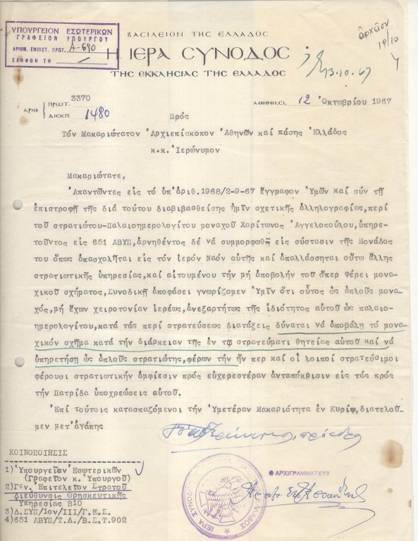 ΒΑΣΙΛΕΙΟΝ ΤΗΣ ΕΛΛΑΔΟΣ Η ΙΕΡΑΣ ΣΥΝΟΔΟΣ ΤΗΣ ΕΚΚΛΗΣΙΑΣ ΤΗΣ ΕΛΛΑΔΟΣ, 12 ΟΚΤΩΒΡΙΟΥ 1967, 1 ΣΕΛΙΔΑ